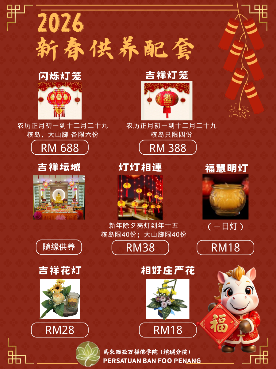 值此马年新春将临之际,万福佛学院(槟城分院)谨此诚挚邀请诸位善信共同发心,参与新春供养诸佛菩萨之殊胜善行。